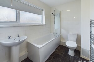 1.80m x 2.45m (5' 11" x 8' 0") Partially tiled three piece suite comprising of a side panelled bath with shower over, pedestal hand wash basin and W/C. Vinyl flooring, gas radiator and frosted UPVC window to the front aspect.